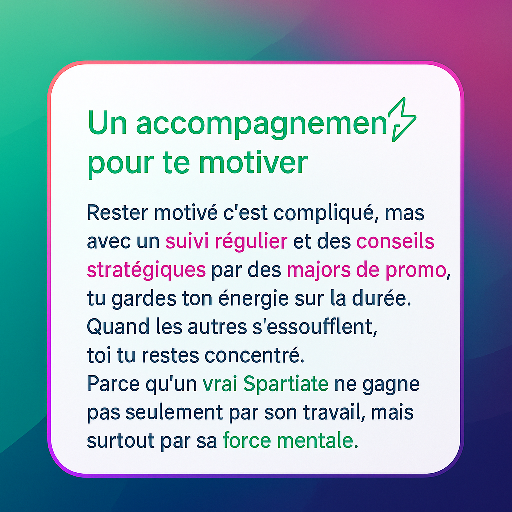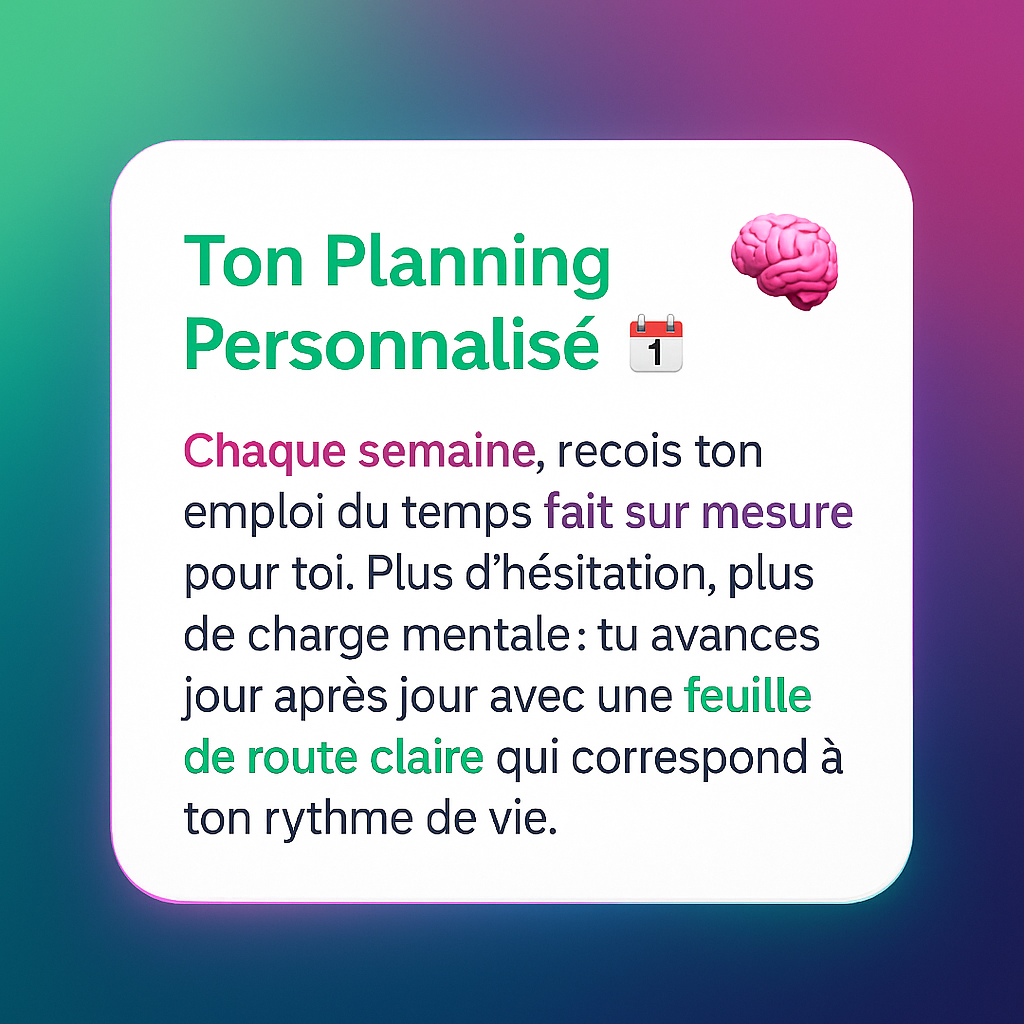Résultat ? Une méthode qui colle à ton parcours. Sans perte de temps, avec des outils et un suivi optimisé pour ta réussite.